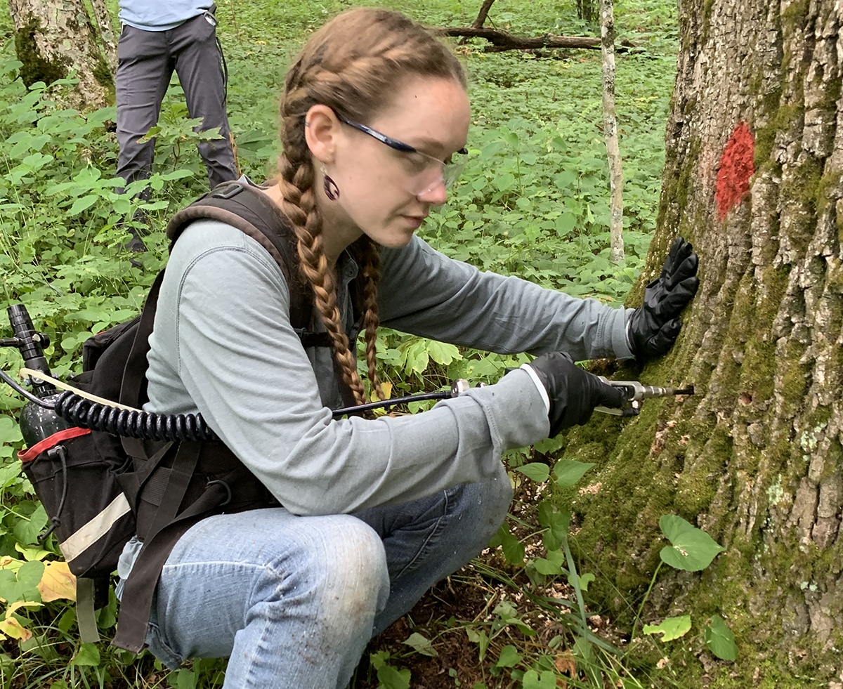 Over the past few years, MountainTrue has taken on the task of identifying and treating priority ash groves around WNC in response to the threat of the Emerald Ash Borer. This non-native invasive insect is wreaking havoc throughout the state, and many of the trees we have treated are surrounded by bare branches from neighboring dead ashes. We have treated over 1,100 trees throughout the region, and committed to re-treating these trees after their initial 3-year treatment wears off.