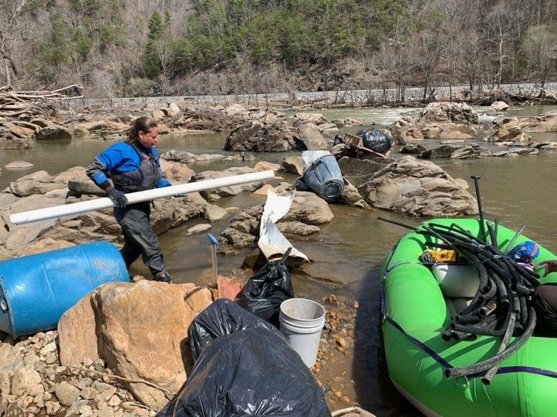 MountainTrue, funded by a grant from the North Carolina Department of Environmental Quality, is focused on removing small, hand-pickable trash from waterways that machines can’t reach. Our work focuses on extracting man-made debris from areas inaccessible to machinery and restoring stream banks to help prevent erosion. MountainTrue will not be removing woody debris.