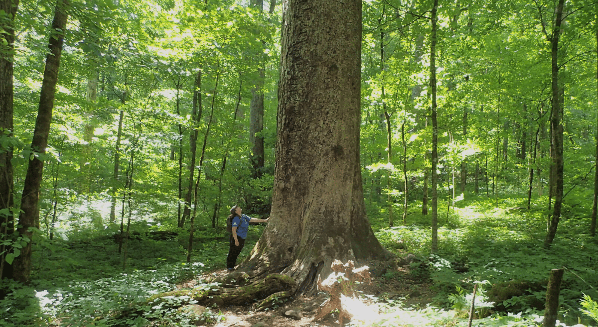 Pictured above: MountainTrue’s AmeriCorps Forest Keeper, Ellianna McLaughlin, stands at the base of a large ash tree in Pisgah National Forest.