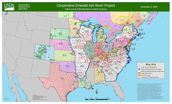 Ash borers can only fly a few miles each year, but they often hitch rides on firewood or other products. This has allowed them to spread more quickly despite the various quarantines and restrictions that are in place around moving wood products across state and county borders. The Emerald Ash Borer was first found on the Tennessee side of Great Smoky Mountain National Park in 2013, and is now found throughout North Carolina – its spread having been assisted by people moving firewood.