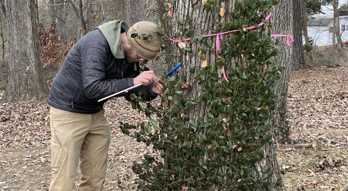 Josh Kelly takes a tree core sample to determine the age of a 120-year-old white oak that was saved from removal.