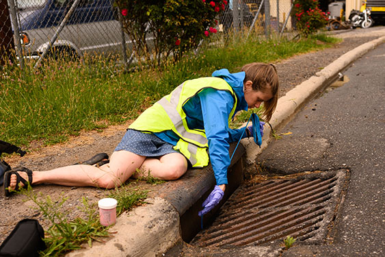MountainTrue’s Watershed Outreach Coordinator Anna Alsobrook fishes for water samples in a storm drain in Asheville’s Southside neighborhood. New funding from the state legislature will increase our ability to conduct water quality testing.