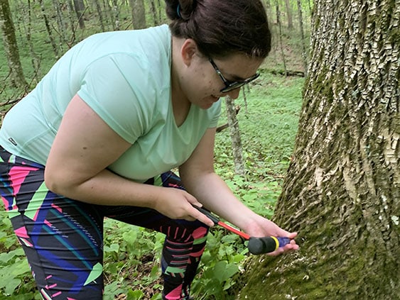 MountainTrue’s AmeriCorps Water Quality Administrator Grace Fuchs re-treats an ash tree during a recent MountainTrue workday.
