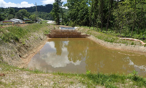 A settling basin installed by NCDOT protects Blair Creek from sediment pollution associated with the widening of NC Hwy. 69 in Clay County.