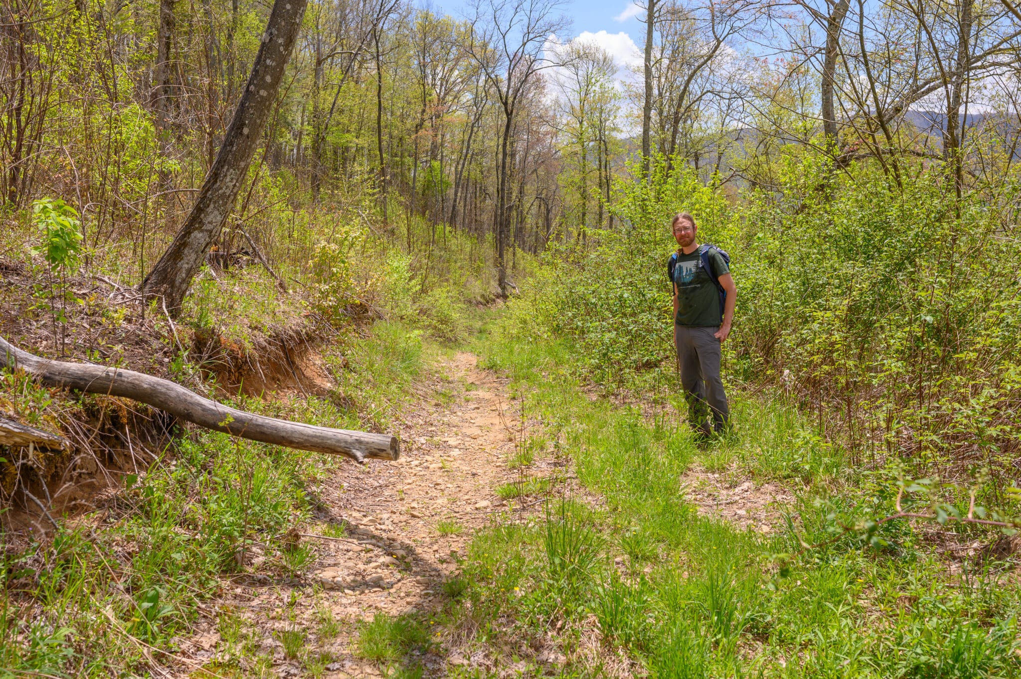 MountainTrue’s Public Lands Biologist, Josh Kelly, next to a “temporary road” built by the Forest Service in 2012 in Nantahala National Forest.