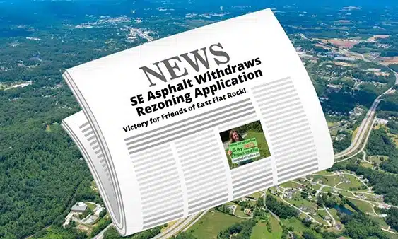 We’re so excited to share the good news that developer SE Asphalt has withdrawn their application to the Henderson County Board of Commissioners requesting rezoning to allow construction of an industrial asphalt plant in East Flat Rock! We are confident that the pressure applied by concerned residents like you raising your voices in opposition to this dangerous proposal is what resulted in this victory for our community. Together we have proven, yet again, that engaged citizens can and do make change for the better in our communities. Huge thanks to the Friends of East Flat Rock and everyone that spoke out in opposition of this project.