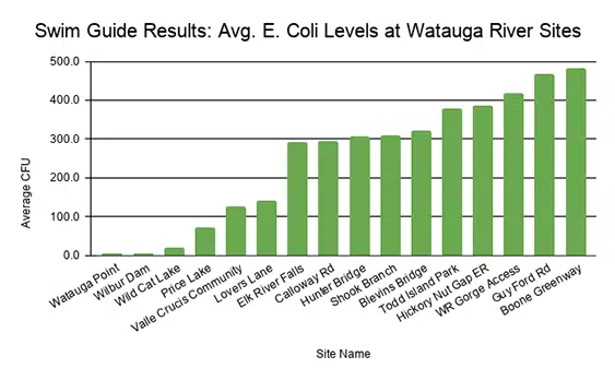 The results are in! Our top 3 cleanest sites are Watauga Point, Wilbur Dam and Wildcat Lake. The three sites that failed the most frequently this summer were Boone Greenway, Guy Ford Road, and WR 321 Gorge Access. The sampling season is over for now, but we will start back up in May. Thank you to our wonderful team of volunteers that makes this program possible!