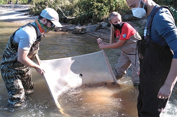 Students from Gardner-Webb University’s Animal Physiology class join our macroinvertebrate sampling on the Broad River.