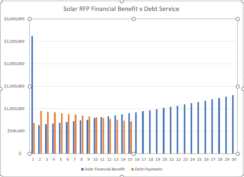 | Year | Solar Financial Benefit | Debt Payments | Cash flow positive? |