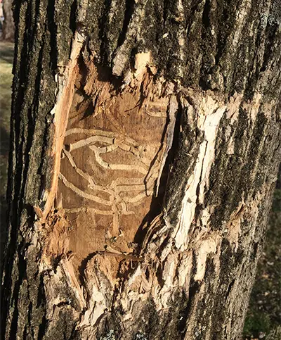 then, they have killed millions of ash trees and threaten millions more. The damage they can cause in just a few years has alarmed scientists and land managers. When the larvae hatch under the bark of an ash tree, they feed on important vascular tissue, creating swirling tunnels called galleries. Eventually, the tree becomes unable to transport nutrients and water from roots to branches, and it dies. Once the trees in one area have been killed, the insect moves on to new territory.